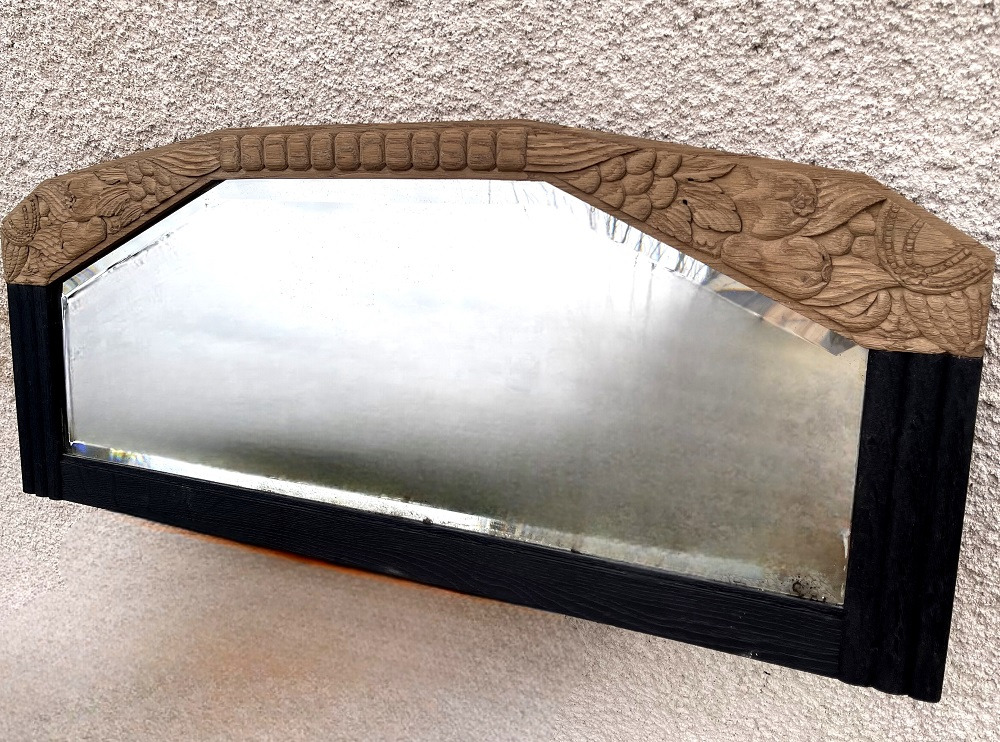 Il est assez rare de voir l'art nouveau s'appliquer jusque sur un miroir, et celui-ci en porte toutes les caractéristiques ! Admirez ses motifs sculptés de fruits et de feuilles, dans le pourtour chêne. Et sa glace biseautée ajoute à son charme !