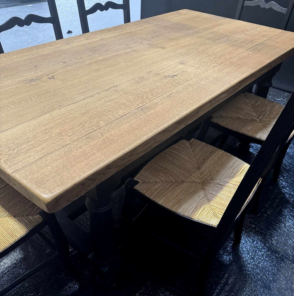 Ce qui donne le ressenti assez massif, et pour tout dire assez lourd, d'une table de salle à manger, c'est évidemment la grande surface de son plateau. Aussi, je l'ai allégé par décapage et ponçage, et j'en ai approché la teinte de celle des dessus de chaises. C'est plus léger, c'est plus souriant !