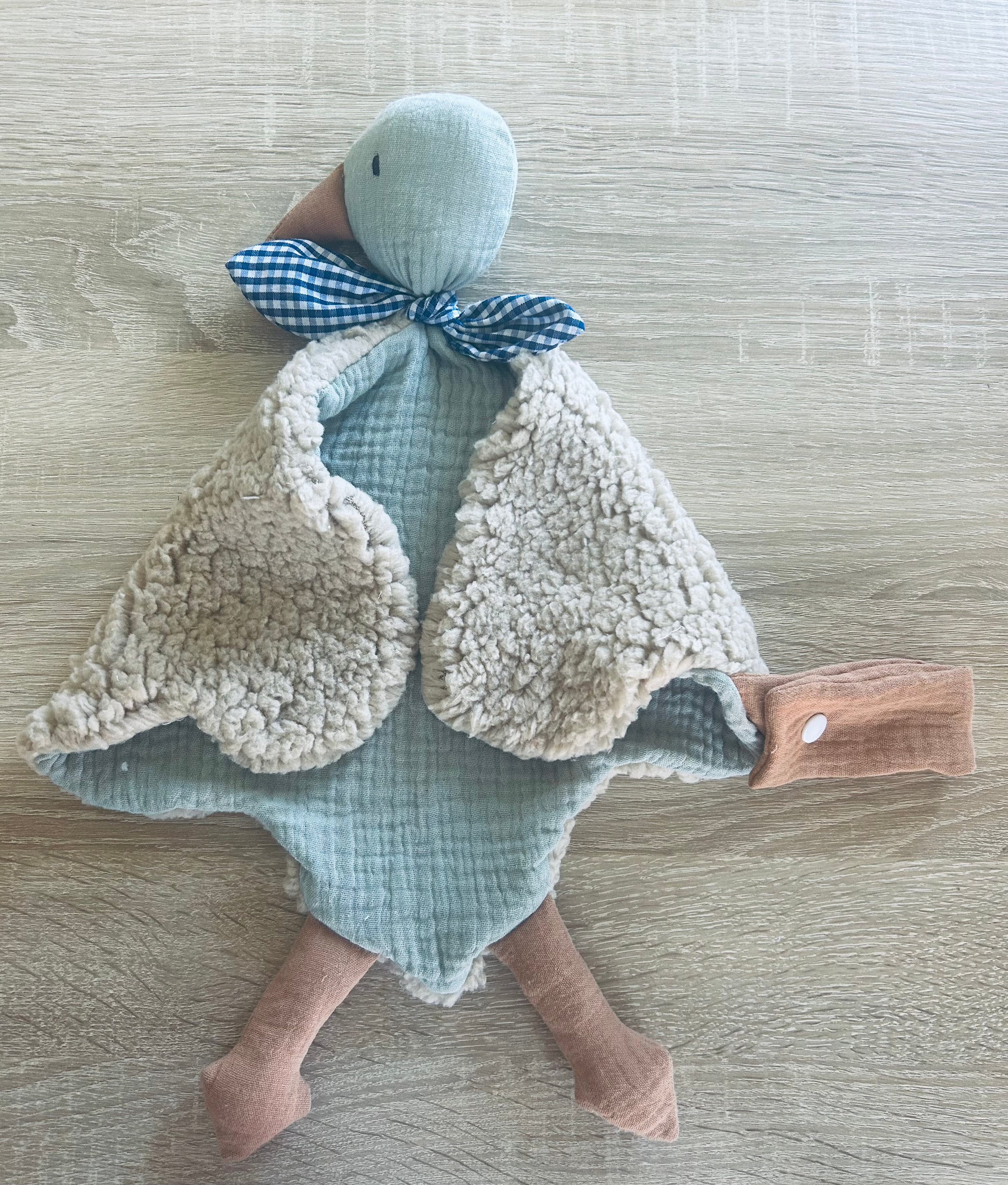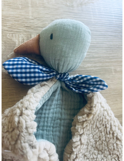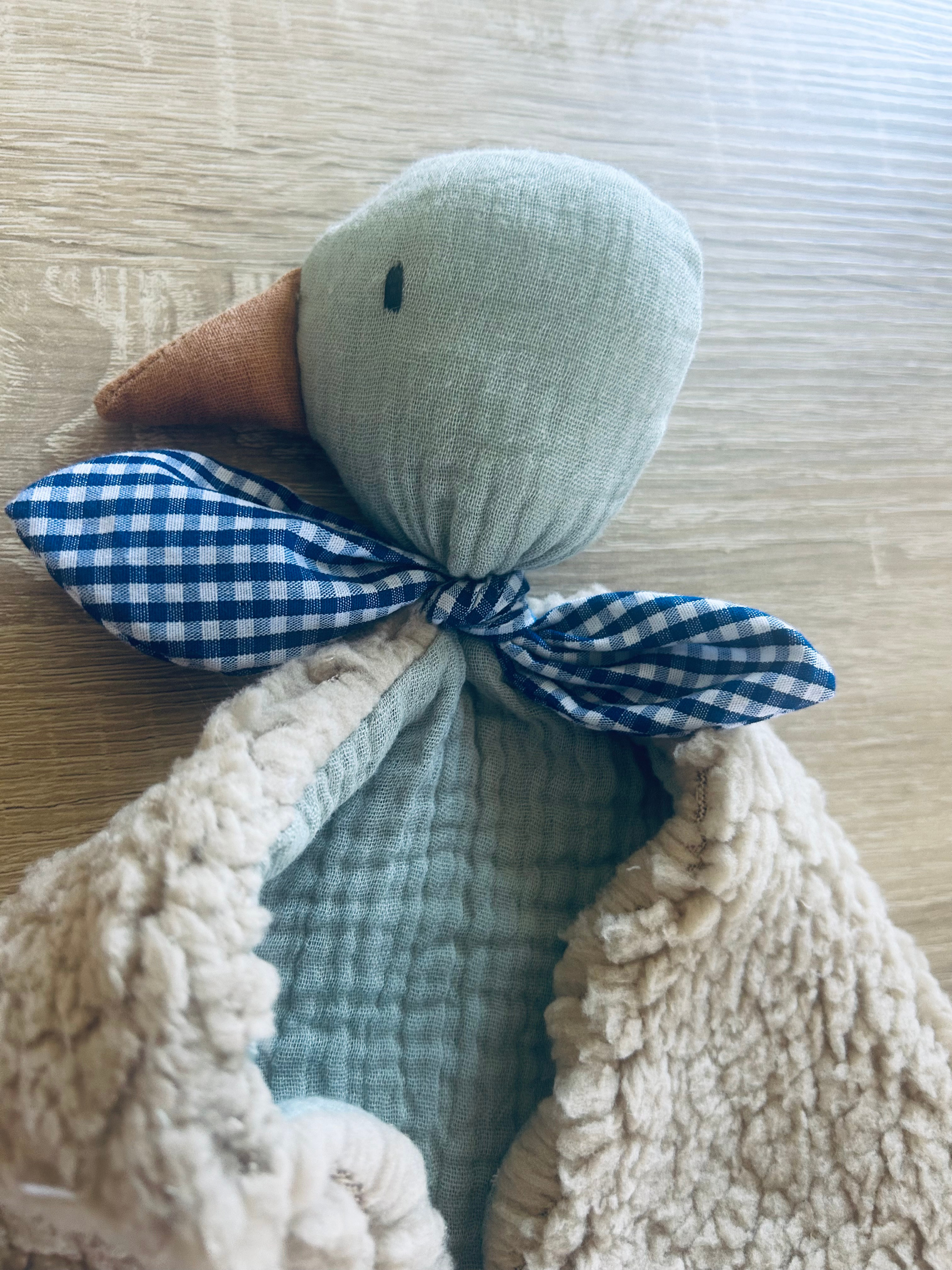Un côté double gaze de coton vert sauge absorbant et un côté tout doux en mouton beige pour rassurer bébé.
