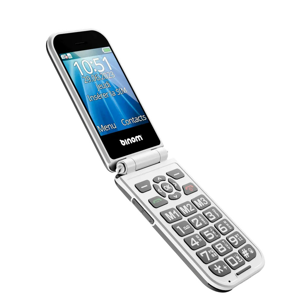 ✓ Binom X3S — téléphone à clapet 4G pensé pour les seniors, simple et robuste ✓ touches larges à fort contraste, écran clair avec gros caractères ✓ notifications visibles à l’extérieur ✓ bouton SOS, appels directs ✓ compatibilité tous opérateurs ✓ calculatrice, radio, agenda