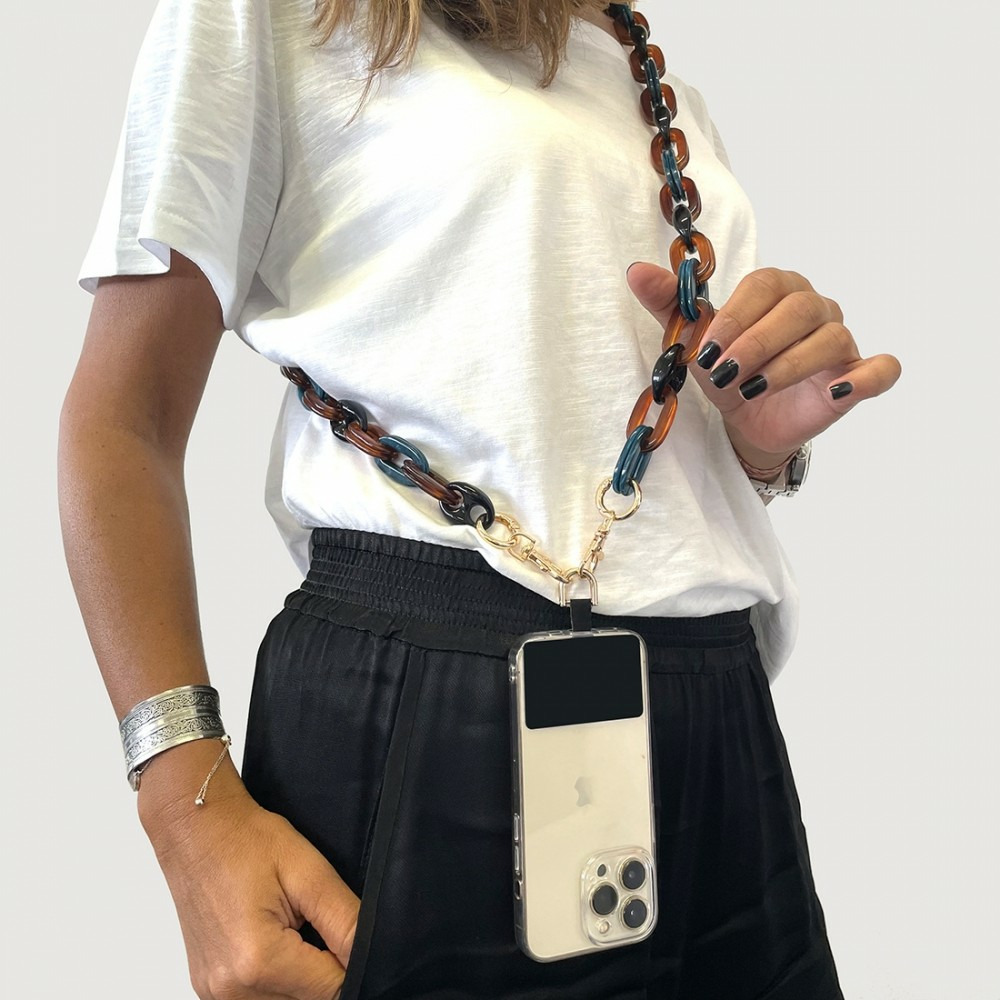 Cette chaine vendu avec un pad universel à placer entre un téléphone et une coque de protection vous permettra de porter votre téléphone comme un sac ou autour du cou tout en gardant les mains libre.