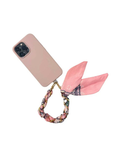 Foulard en soie d’environ 25cm de long, chaîne dorée robuste, compatible avec tous modèles de smartphones (iPhone, Samsung, Xiaomi, etc.) et coques rigides.