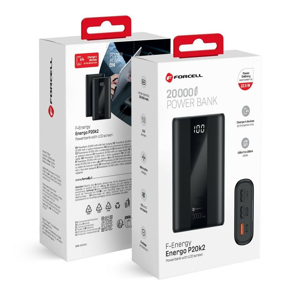 La Forcell F‑ENERGY P20K2 est une batterie externe performante et fiable, pensée pour les utilisateurs nomades. Sa capacité de 20 000 mAh permet plusieurs recharges complètes des smartphones et tablettes, idéale pour les voyages ou une journée chargée.