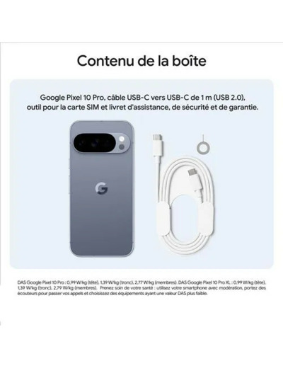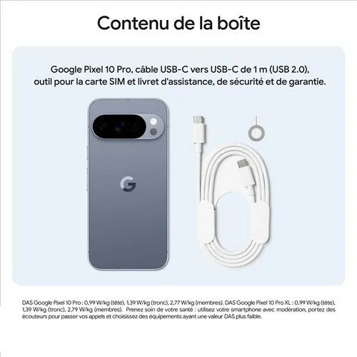 Le Pixel 10 Pro est proposé en plusieurs capacités de stockage : 128 Go (1 099 €), 256 Go (1 199 €), avec 16 GB de RAM. Il est disponible en coloris quartz gris, porcelaine ou noir volcanique.