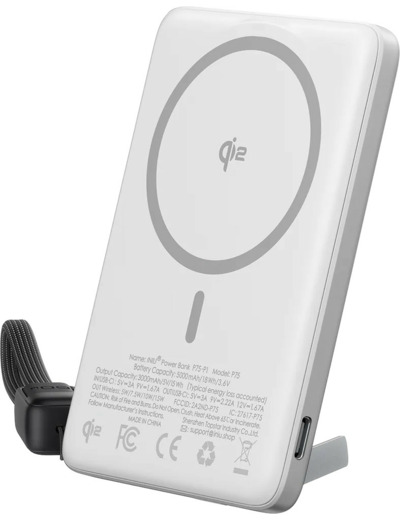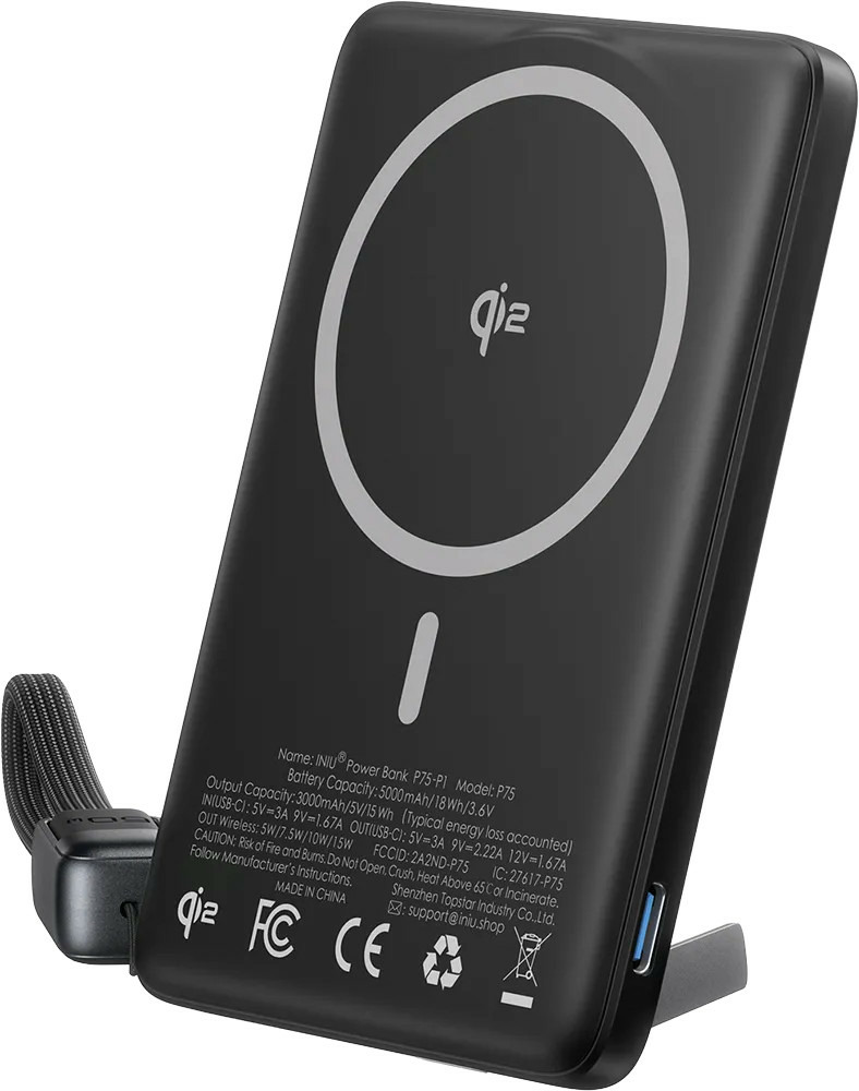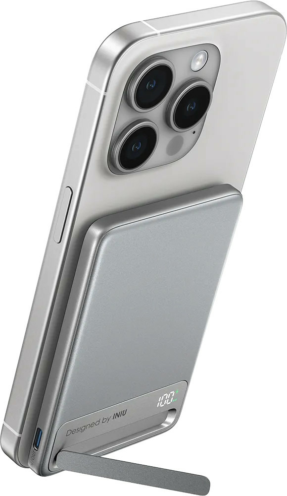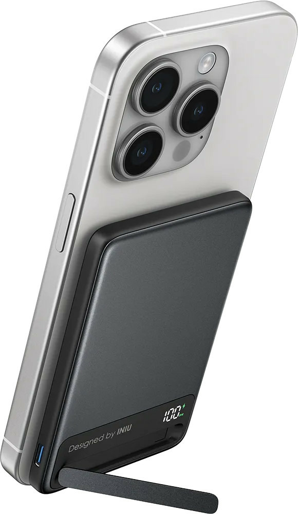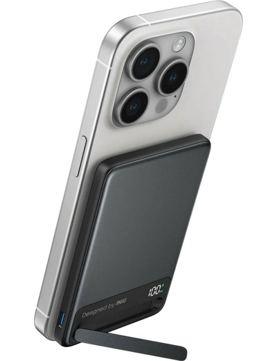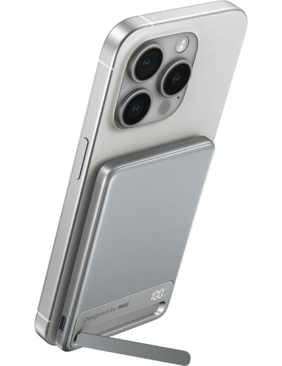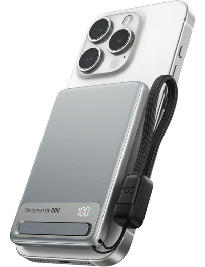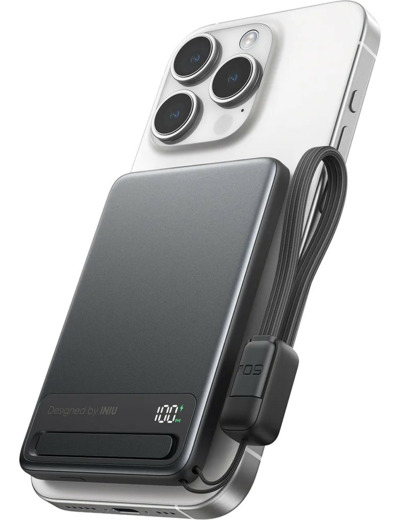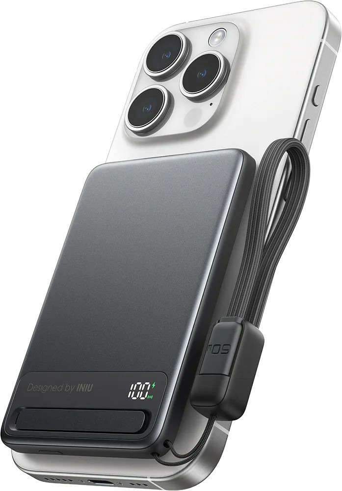 ✓ powerbank INIU MagPro Slim 5 000 mAh avec charge sans fil MagSafe / Qi jusqu’à 15W ✓ charge filaire rapide USB-C jusqu’à 20W avec câble attaché ✓ format slim avec stand intégré