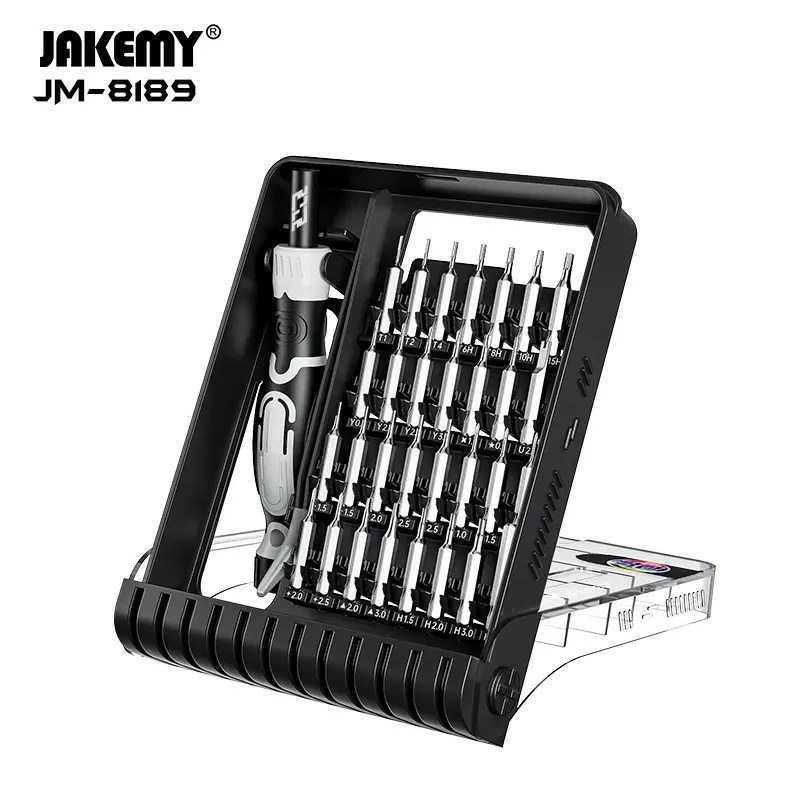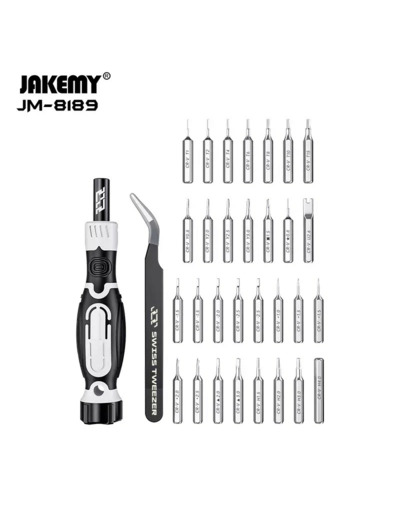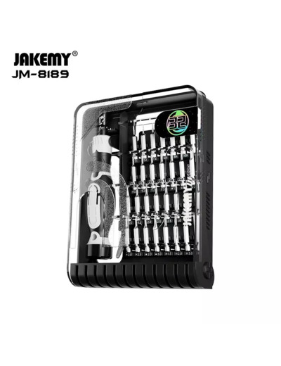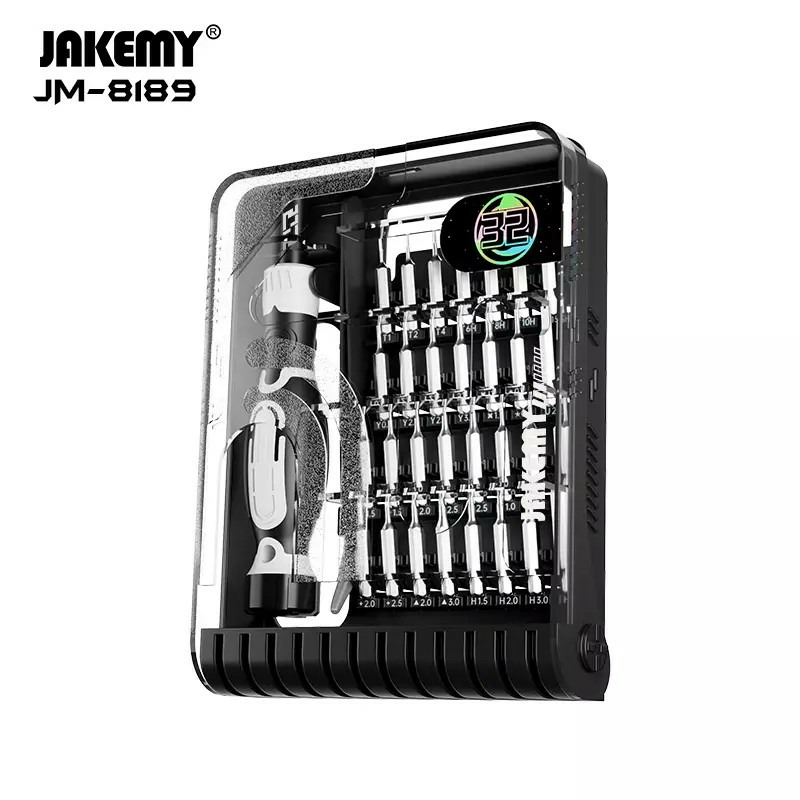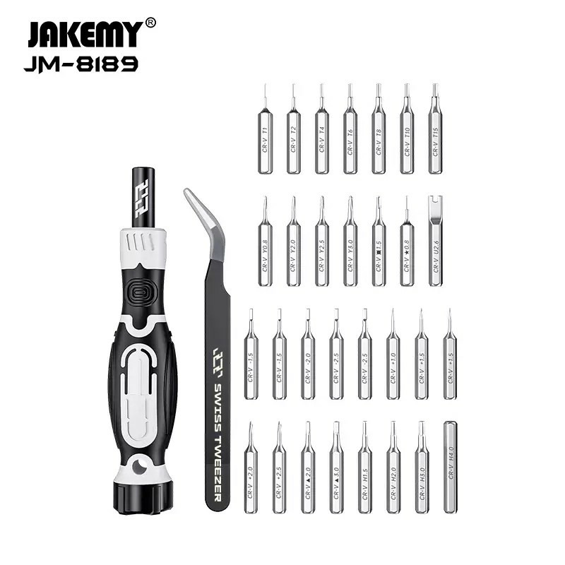 ✓ kit JAKEMY JM-8189A 32-en-1 — complet, précis, idéal pour les petites réparations électroniques ✓ 30 embouts CR-V de 28 mm (8 types), poignée magnétique ergonomique + pince fine ✓ design compact et léger (≈ 220 g), boîte bien pensée pour un usage pratique