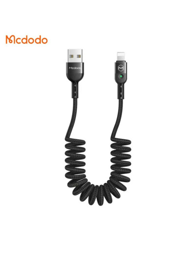 ✓ câble USB‑A vers Lightning McDodo rétractable, longueur extensible jusqu’à 1,8 m ✓ charge rapide 2 A, compatible iPhone/iPad ✓ connecteur spiralé anti-nœuds, compact et flexible ✓ LED verte intégrée pour repérer le câble dans le noir ✓ tresse nylon + embouts aluminium, > 30 000 flexions testées