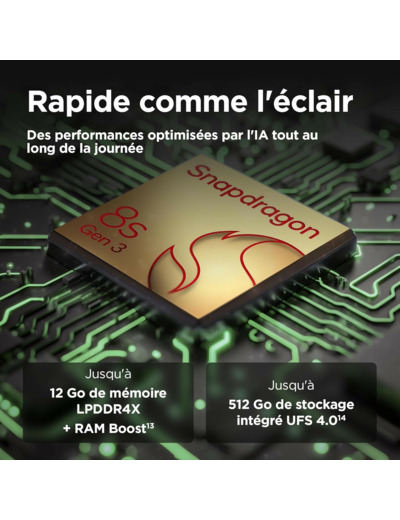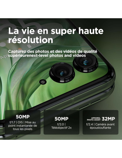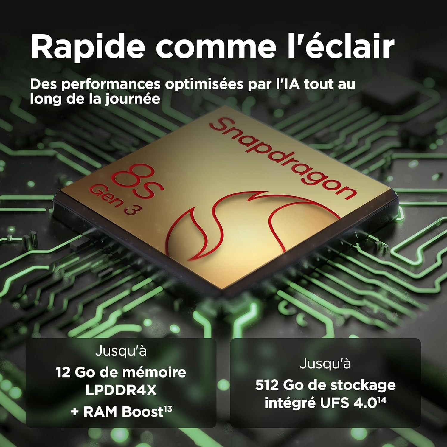 Le Razr 50 Ultra est propulsé par le Snapdragon 8s Gen 3, un processeur qui combine fluidité multitâche et réactivité dans les jeux. Avec ses 12 Go de RAM et jusqu’à 512 Go de stockage UFS 4.0, il répond aux besoins des utilisateurs exigeants.