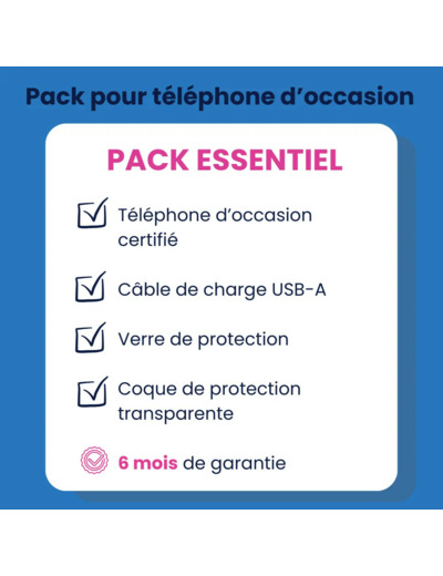✓ Pack Essentiel pour smartphone d’occasion ✓ téléphone d’occasion certifié ✓ câble de charge USB-A ✓ verre de protection ✓ coque transparente ✓ 6 mois de garantie