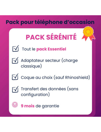 ✓ Pack Sérénité pour smartphone d’occasion ✓ protection complète ✓ chargeur secteur inclus ✓ coque au choix ✓ transfert des données ✓ 9 mois de garantie