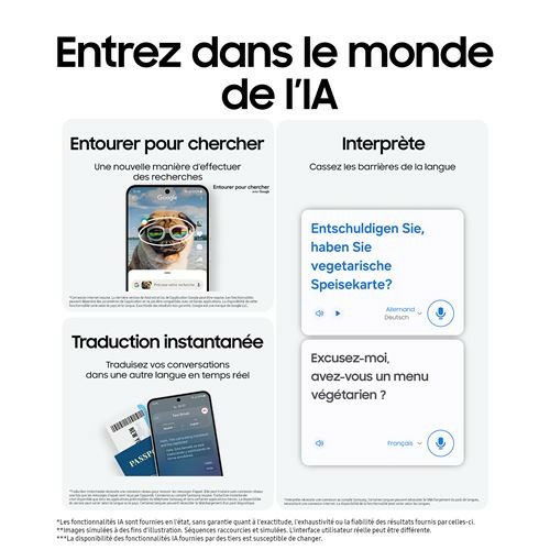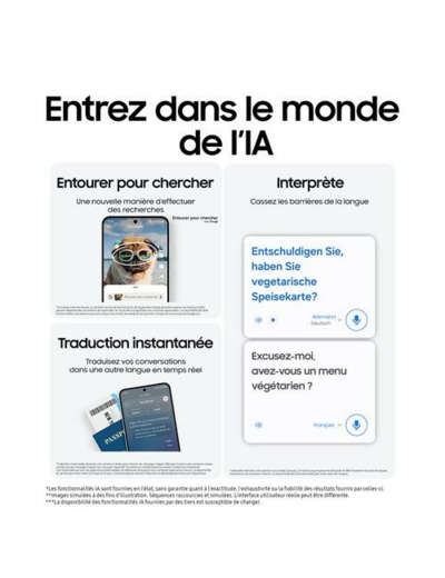 Galaxy AI (Live Translate, Sketch‑to‑Image, Circle to Search…) est intégré gratuitement. Samsung engage le téléphone sur 7 ans de mises à jour Android et sécurité, un véritable atout fiabilité.