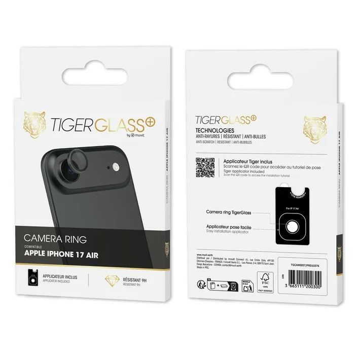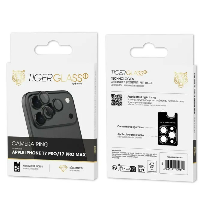 Le Tiger Glass Plus Camera Ring est un anneau de protection en verre trempé conçu pour préserver les objectifs photo de votre iPhone contre rayures, poussières et chocs légers. Placé sur chaque lentille, il protège sans compromettre la clarté ou le contraste des images.