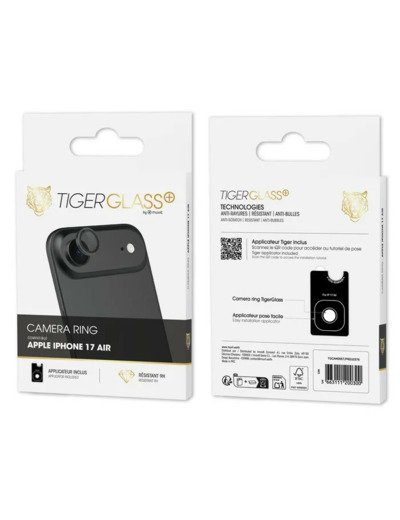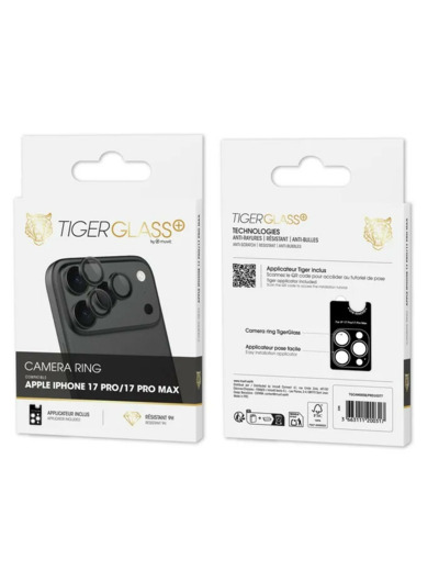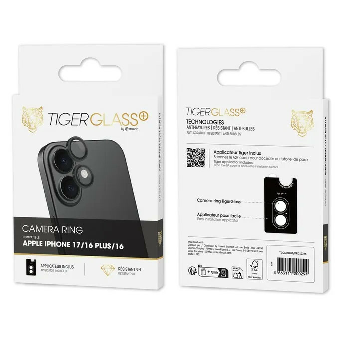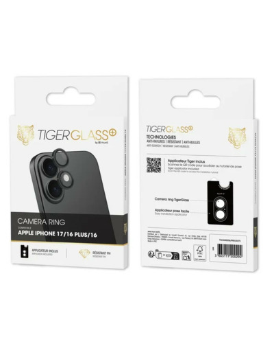 ✓ protecteur de caméra Tiger Glass Plus Camera Ring — verre trempé de haute résistance pour vos objectifs ✓ finition 9H Mohs ✓ protége des rayures, poussières et chocs légers ✓ design précis pour les modèles iPhone 16 / 16 Plus / 17 (tous les modèles)