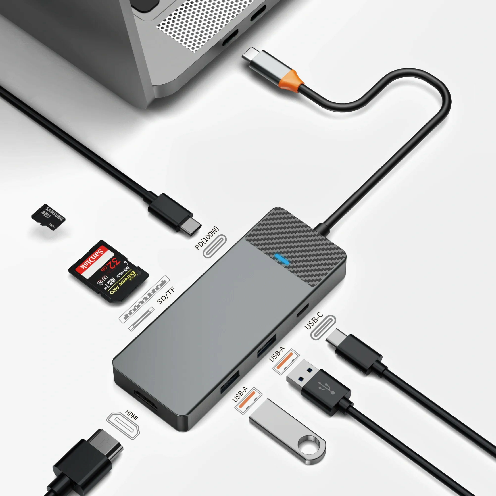 Le WIWU Hub USB-C 7 en 1 (Linker 721HD) réunit l’essentiel pour étendre votre poste de travail : un port HDMI 4K, trois USB 3.0, des lecteurs SD/Micro SD, un Ethernet RJ45 et une entrée USB-C Power Delivery pour l’alimentation.