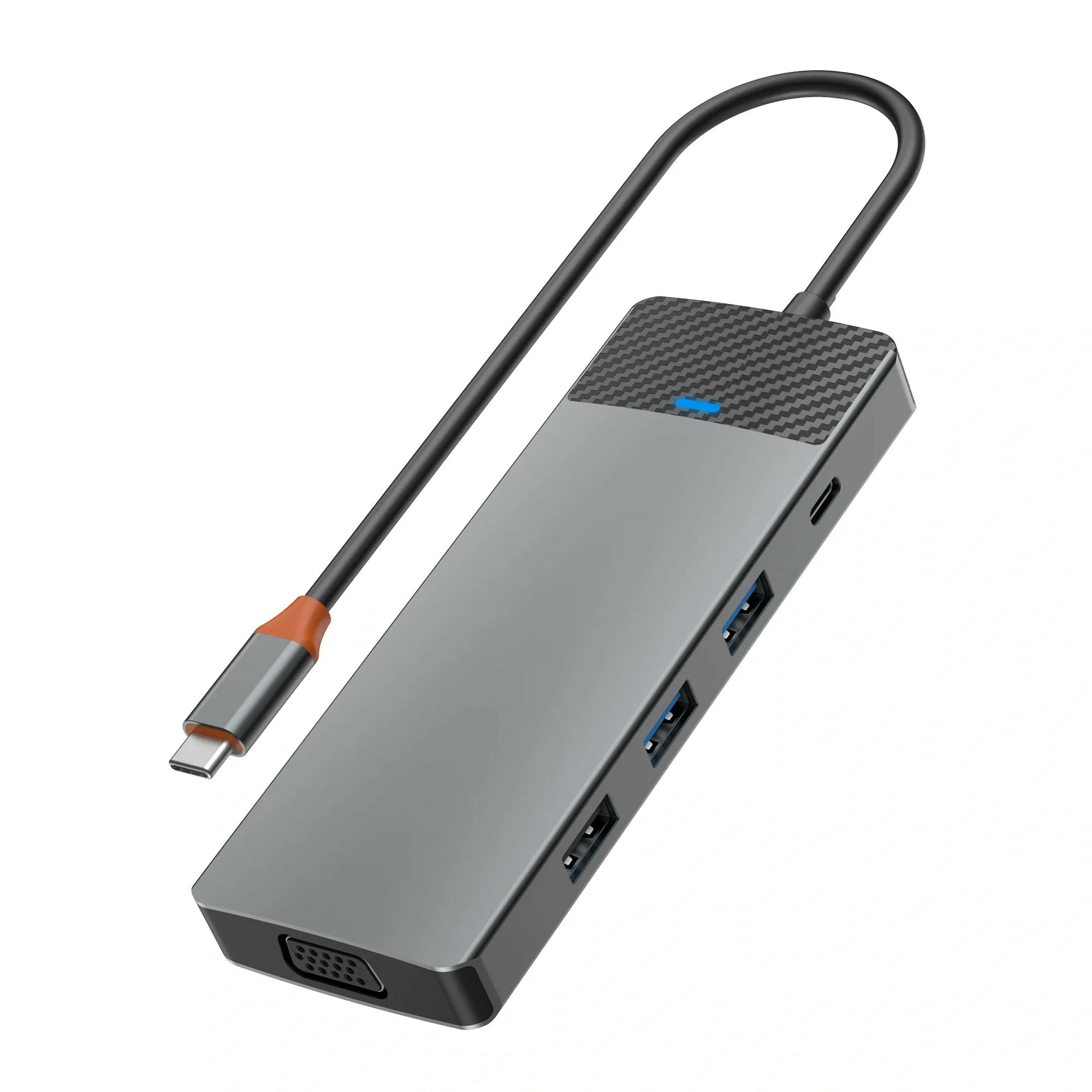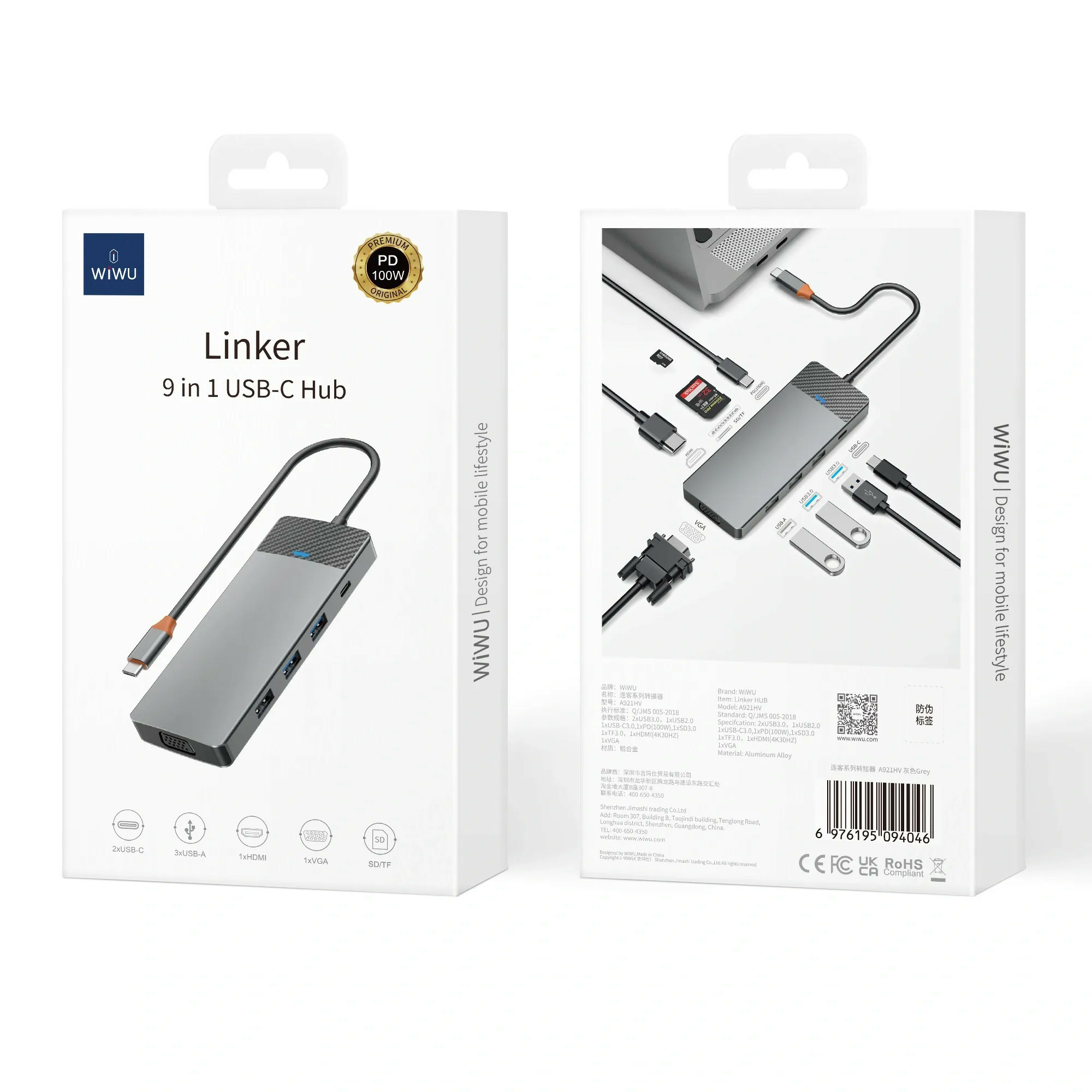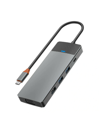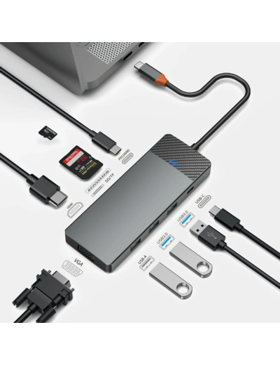 Le hub WIWU USB-C 9-en-1 (Linker 921HV) propose une palette étendue de ports : 2 USB 3.0, 1 USB 2.0, 1 USB-C 3.0, port PD 100 W, HDMI 4K 30 Hz, VGA 1080 p, lecteurs de carte SD/TF, et Ethernet RJ45 pour une connectivité à la fois complète et compacte.