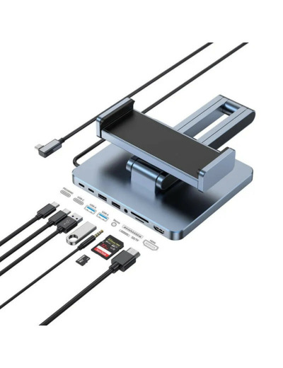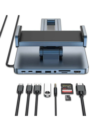 Le WiWU AH801 combine un support tablette ajustable et un hub multifonctions riche : sortie HDMI en 4 K, 2 ports USB 3.0, port USB-C pour données, lecteurs SD/TF, prise audio 3,5 mm et port PD pour l’alimentation. Idéal pour créer un espace de travail fluide et connecté.