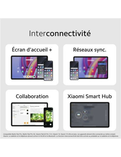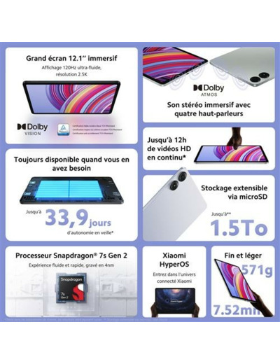 Avec ses 4 haut-parleurs stéréo compatibles Dolby Atmos et Dolby Vision, la Redmi Pad Pro offre une immersion audio remarquable. Elle est compatible avec le Redmi Smart Pen et un clavier Bluetooth pour transformer la tablette en outil de productivité mobile.