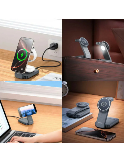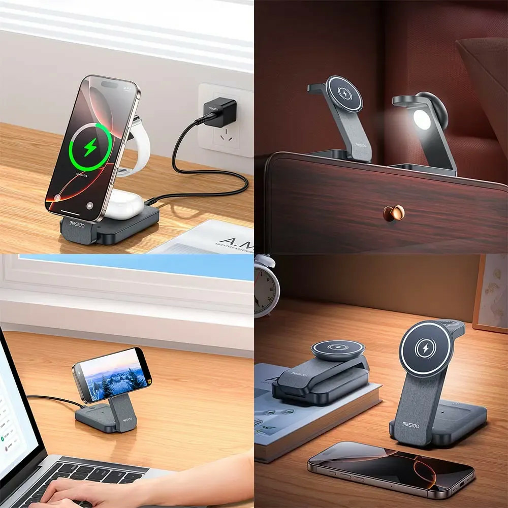 La YESIDO est une station de charge sans fil pensée pour simplifier votre quotidien : vous pouvez recharger un iPhone, une Apple Watch, des AirPods en même temps. Fini les câbles qui s’entremêlent sur le bureau ou la table de nuit — tout est regroupé sur une base unique, stable et élégante.