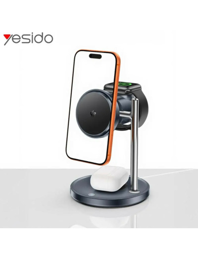 La station de charge sans fil YESIDO 3 en 1 permet de recharger simultanément un smartphone compatible Qi2, une montre connectée et des écouteurs sans fil, tout en réduisant l’encombrement des câbles sur un bureau ou une table de nuit.
