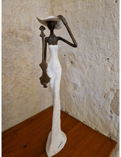 Statue de 55 cm environ, coulée en bronze avec la technique de la cire perdue. Porteuse d'un chapeau, d'une robe fourreau blanche et porteuse d'un violon, cette élégante diffuse une image contemporaine et cultivée de la femme africaine.
