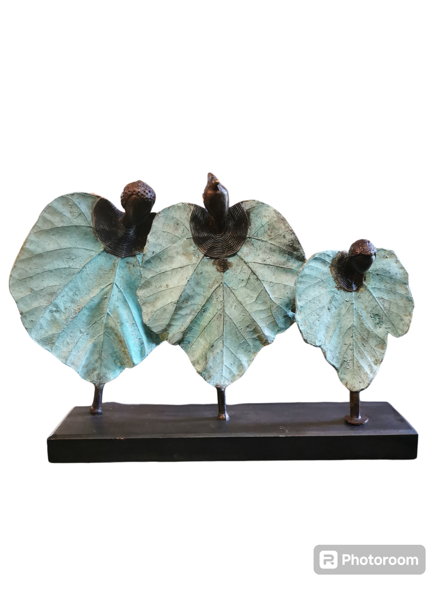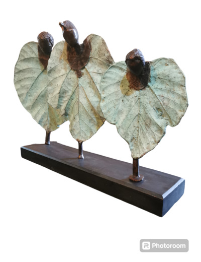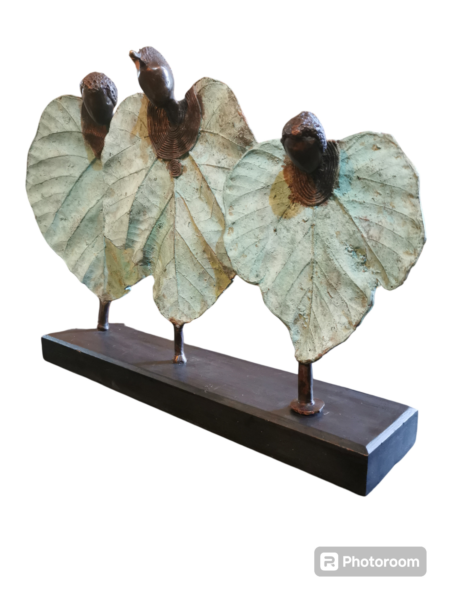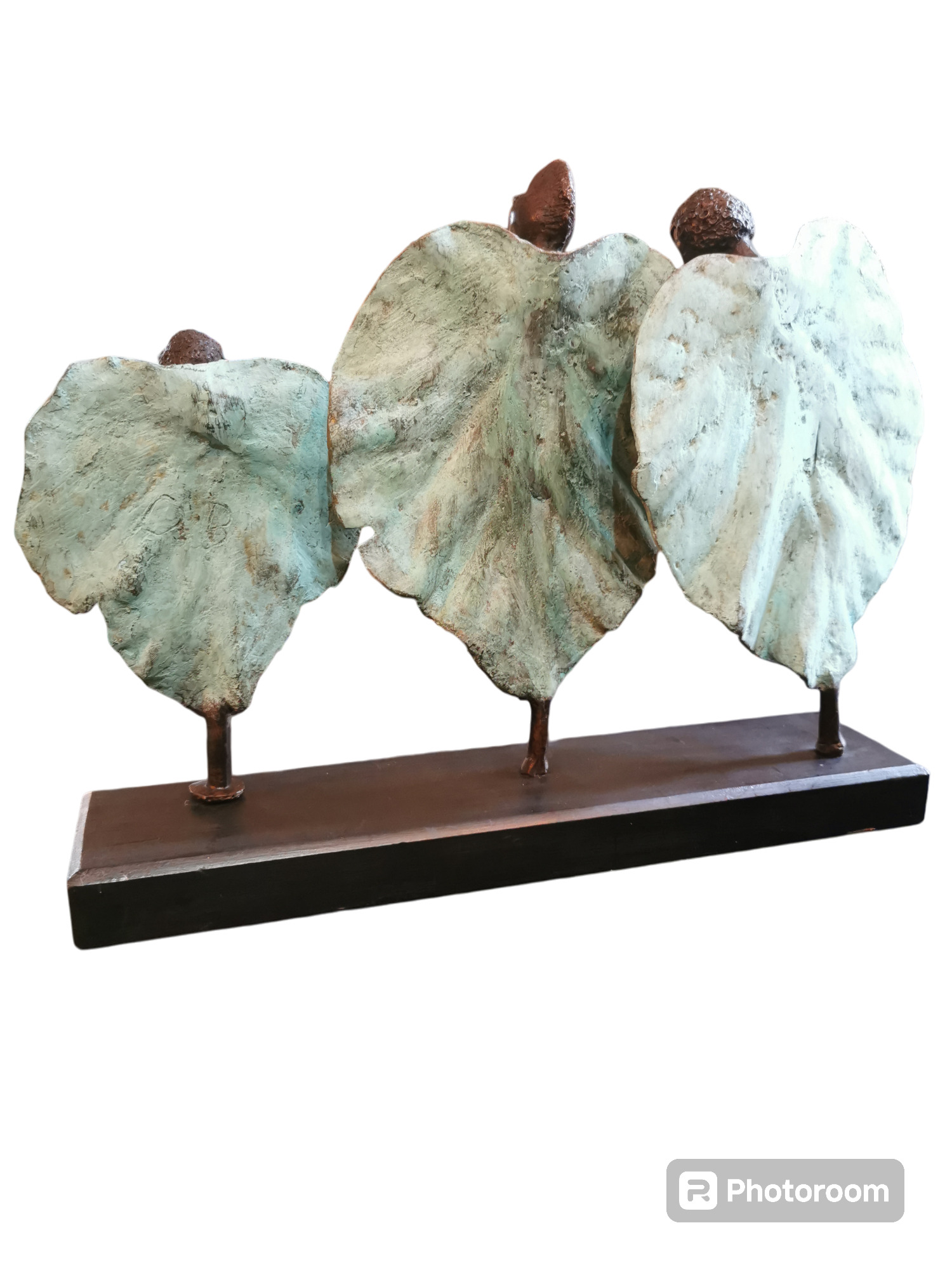 3 membres de la même famille au corps de feuilles, regroupés sur un socle en bois. Empreinte de feuilles et bronzes coulées avec la technique de la cire perdue par Boureima OUEDRAOGO à Ouagadougou au Burkina Faso
