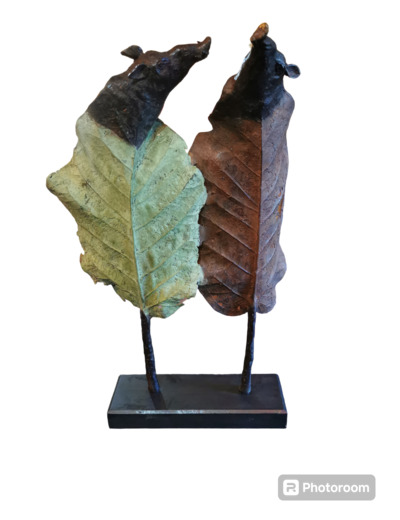 Œuvre inédite et contemporaine de Boureima OUEADROGO représentant 2 sangliers à corps de feuilles. Le tout est disposé sur un socle en bois.