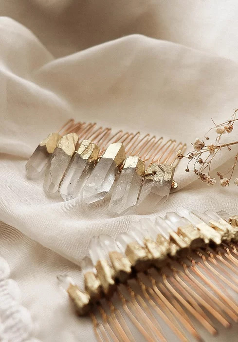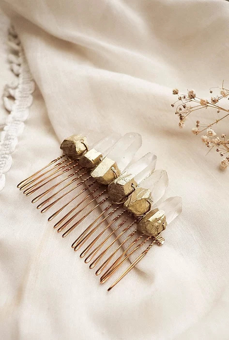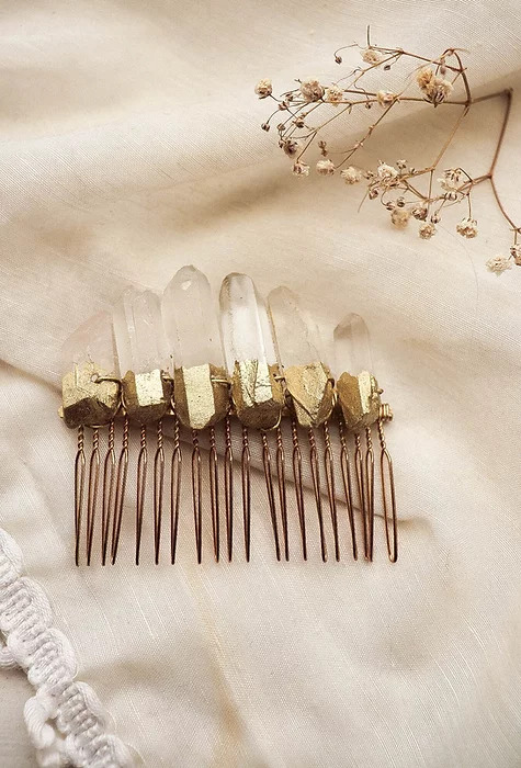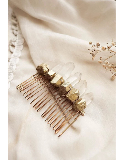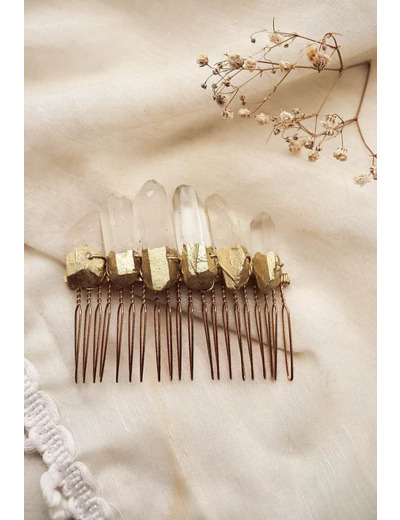 Le peigne Eugénie élégant et intemporel, ravivera les amoureuses des cristaux avec l'opulence de ses pierres ! Peigne en pointes de quartz brut, délicatement dorées.