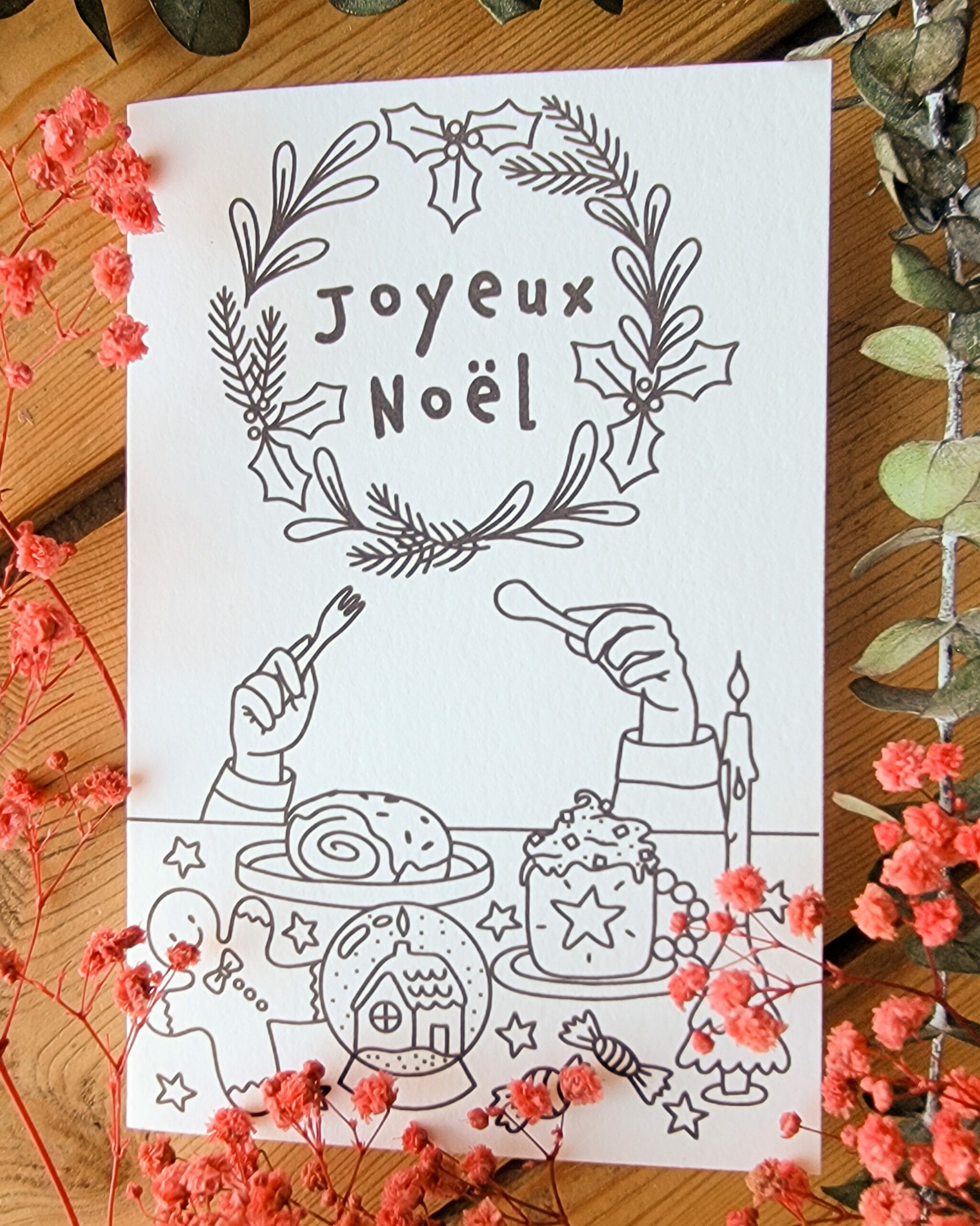 Sur ce modèle imprimé sur papier épais, une table couverte de gourmandises t’invite à ralentir. Tasse fumante, bonbons colorés, bonhomme en pain d’épice, boules à neige et grande couronne “Joyeux Noël”. Chaque détail devient un motif à broder, à personnaliser selon ton inspiration.