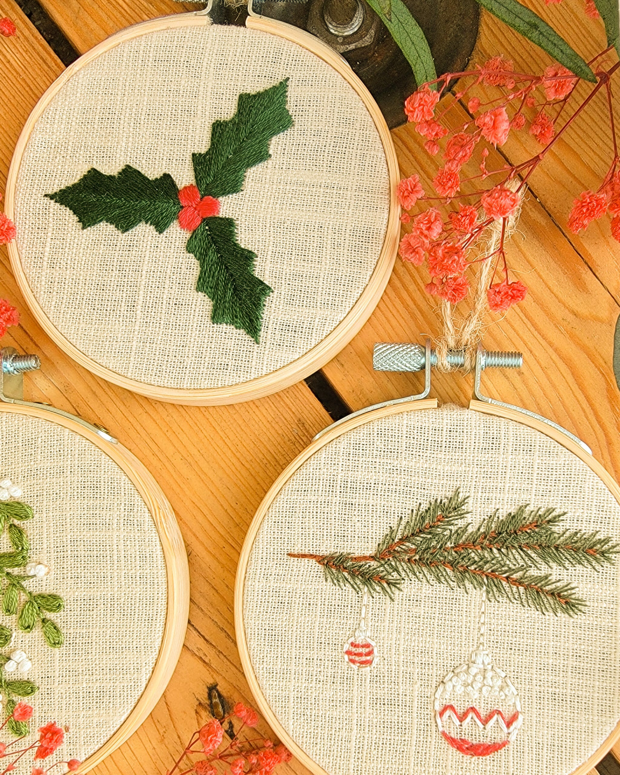 Ce patron broderie Noël à imprimer te permet de créer trois jolies suspensions de Noël brodées. Tu vas broder un motif de houx, un sapin et une branche de gui, inspirés des décors traditionnels de Noël. Tu peux même ajouter ta petite touche en brodant des flocons de neige.
