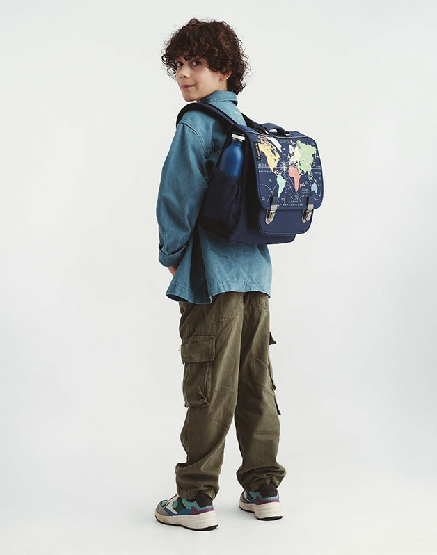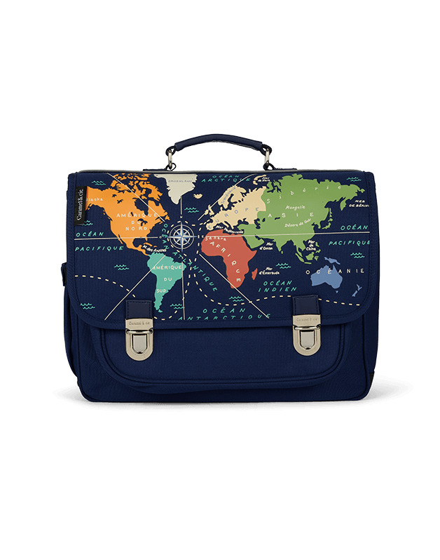 Moyen cartable scolaire de 38cm, le meilleur choix pour un enfant au CP, CE1 et CE2, ou d’une stature entre 1,10m et 1,30m. Ce cartable au motif de carte du monde détaillée est parfait pour accompagner les enfants dans leur apprentissage de la géographie ou tout simplement pour rêver et voyager.