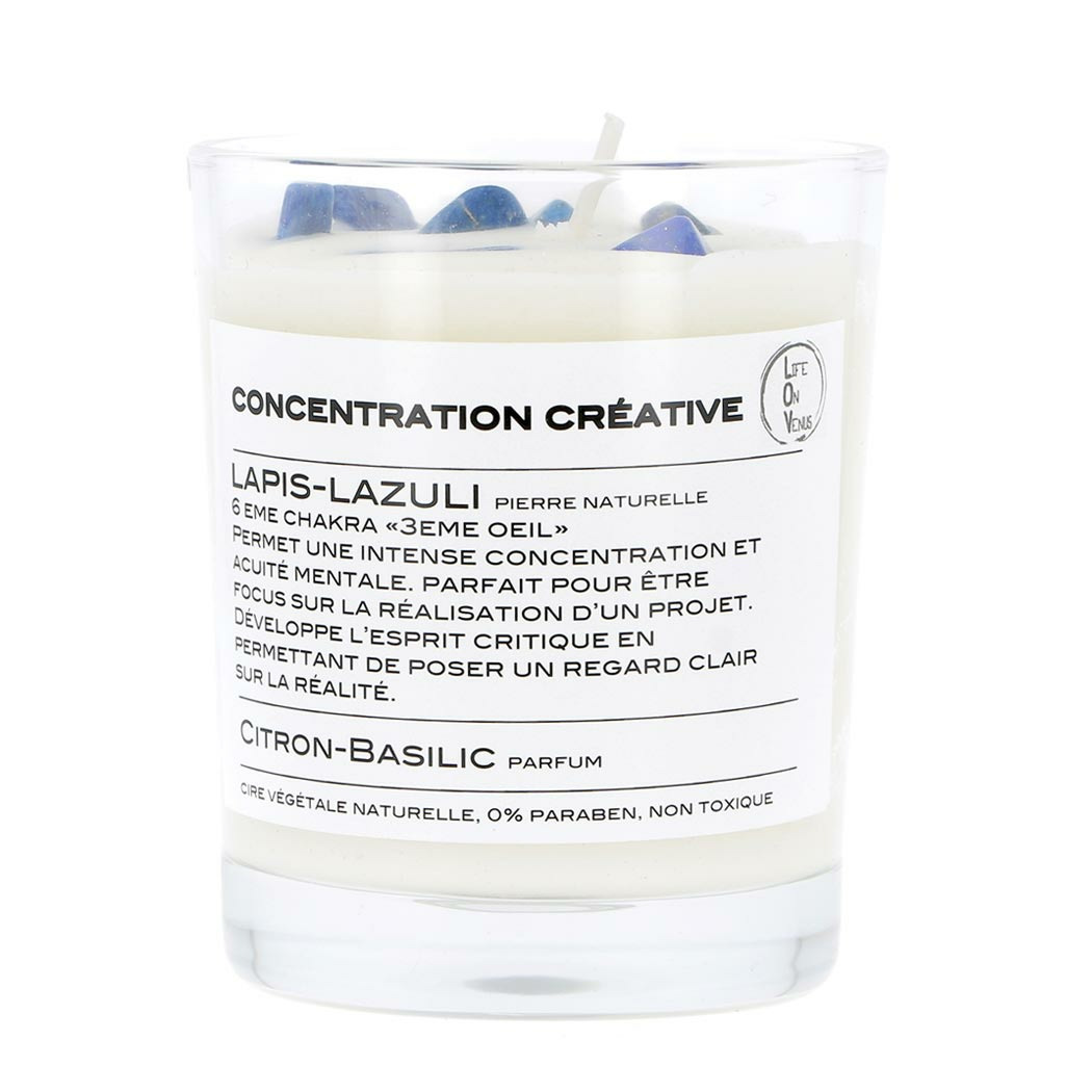 La bougie parfumée Concentration Créative est composée de cire 100% végétale et de Lapis-lazuli, à la senteur citron et basilic. Son parfum est créé à Grasse par un maître parfumeur, et formulé pour une haute qualité de diffusion.