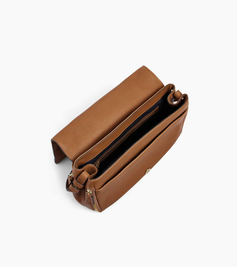 Besace à rabat petit modèle avec marquage Le Tanneur et doublure Crépuscule. Porté croisé ou épaule grâce à ses deux bandoulières ajustables. Cuir de vachette pleine fleur grainé. Doublure textile bleu marine. 2 poches plates et 1 poche zippée. 2 soufflets zippés, 1 poche arrière bouton aimanté. Bandoulière ajustable et mini bandoulière porté épaule. Accessoires métalliques finition doré clair.