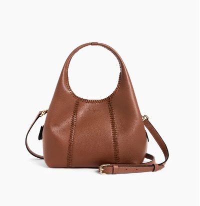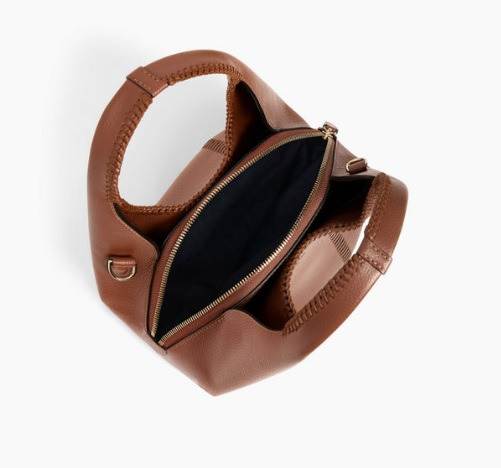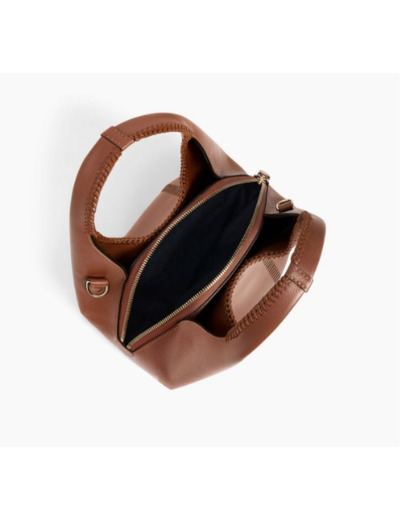 Ce petit sac à main souple est en cuir grainé avec surpiqûres.