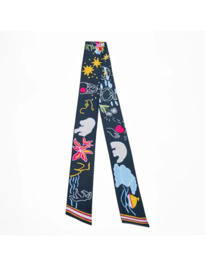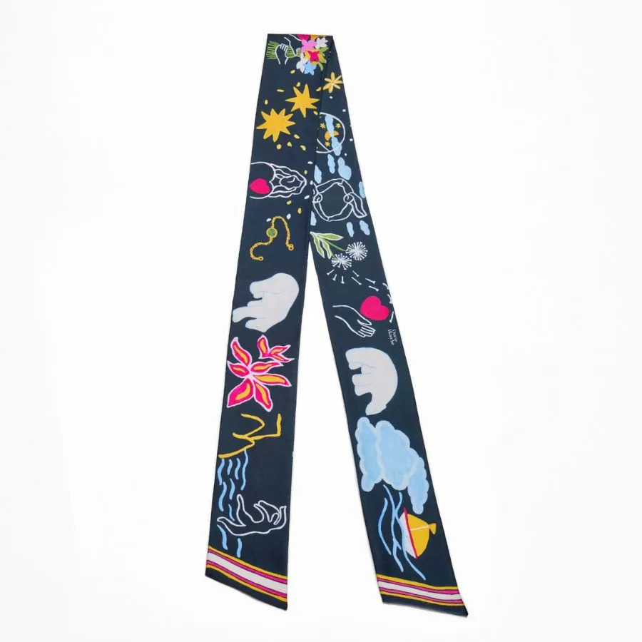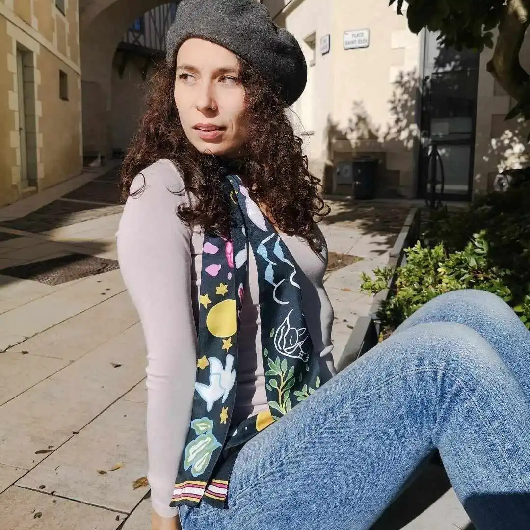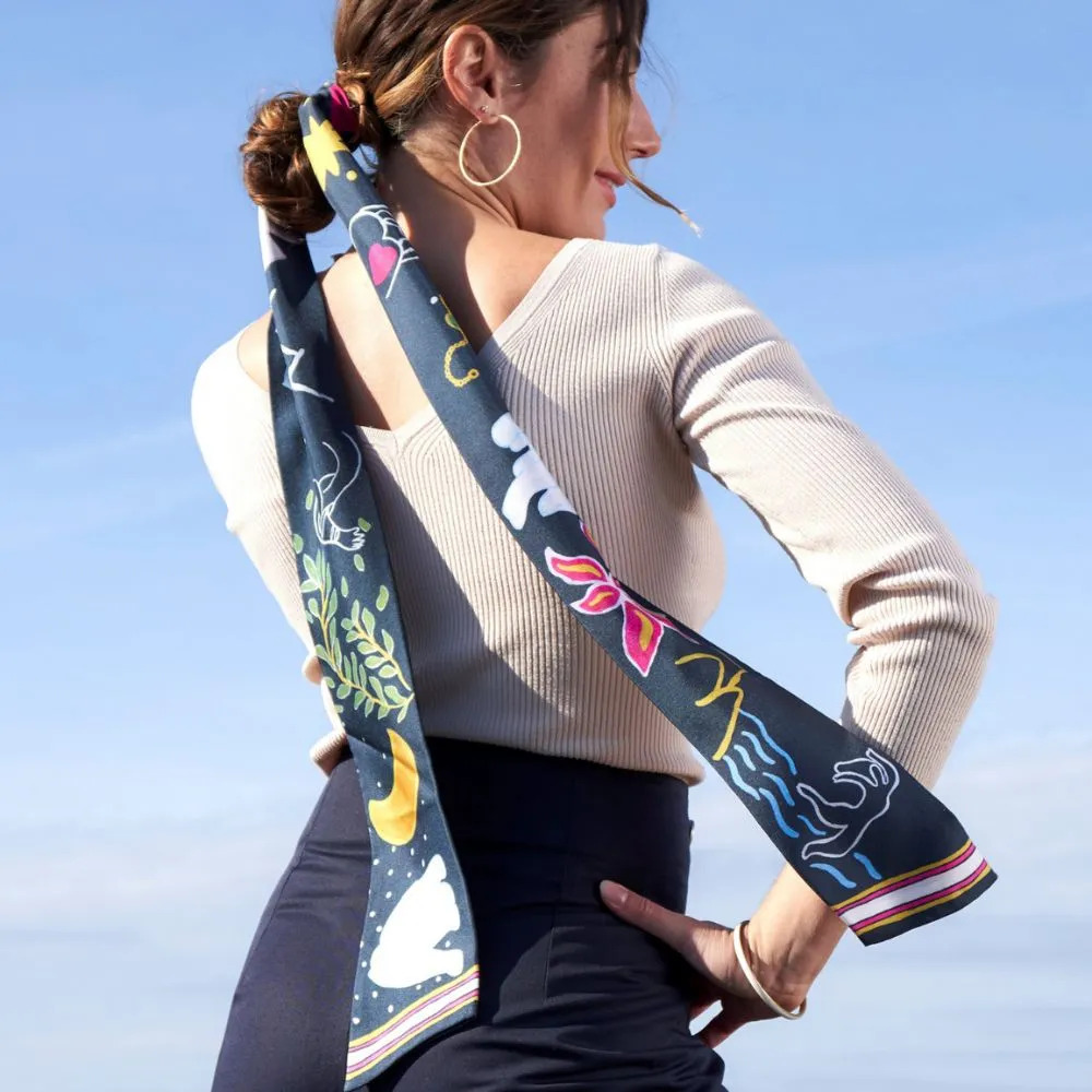 Le grand bandeau en soie Vive est imprimé en recto et verso de dessins uniques. Vive reprend tous les symboles d’Ourse Blanche; des symboles de liberté, de féminité, de joie de vivre.