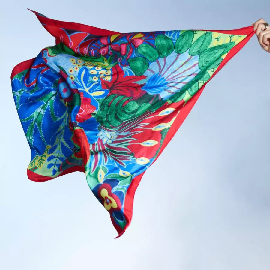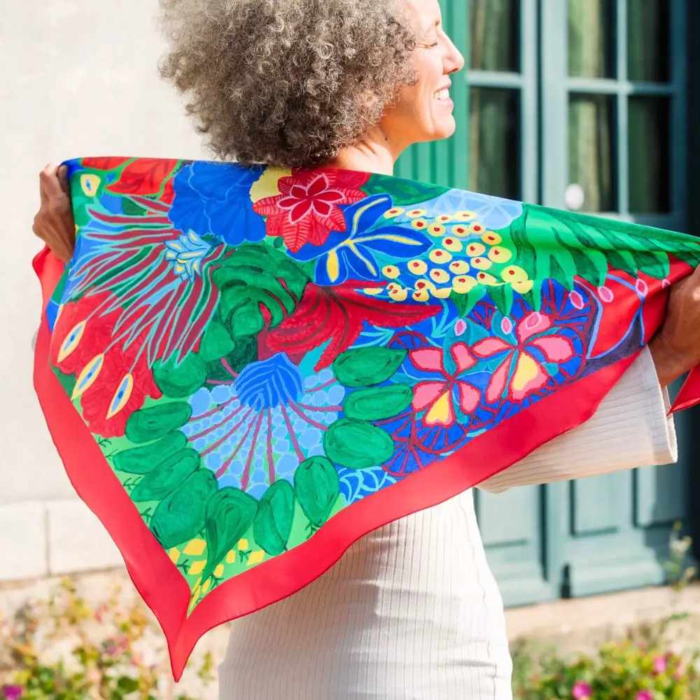 Le grand foulard en soie Eclore est vibrant de couleurs vives et foisonnant de plantes luxuriantes et de fleurs épanouies. Tableau inspiré de la jungle colorée et inextricable du Douanier d’Henri Rousseau.