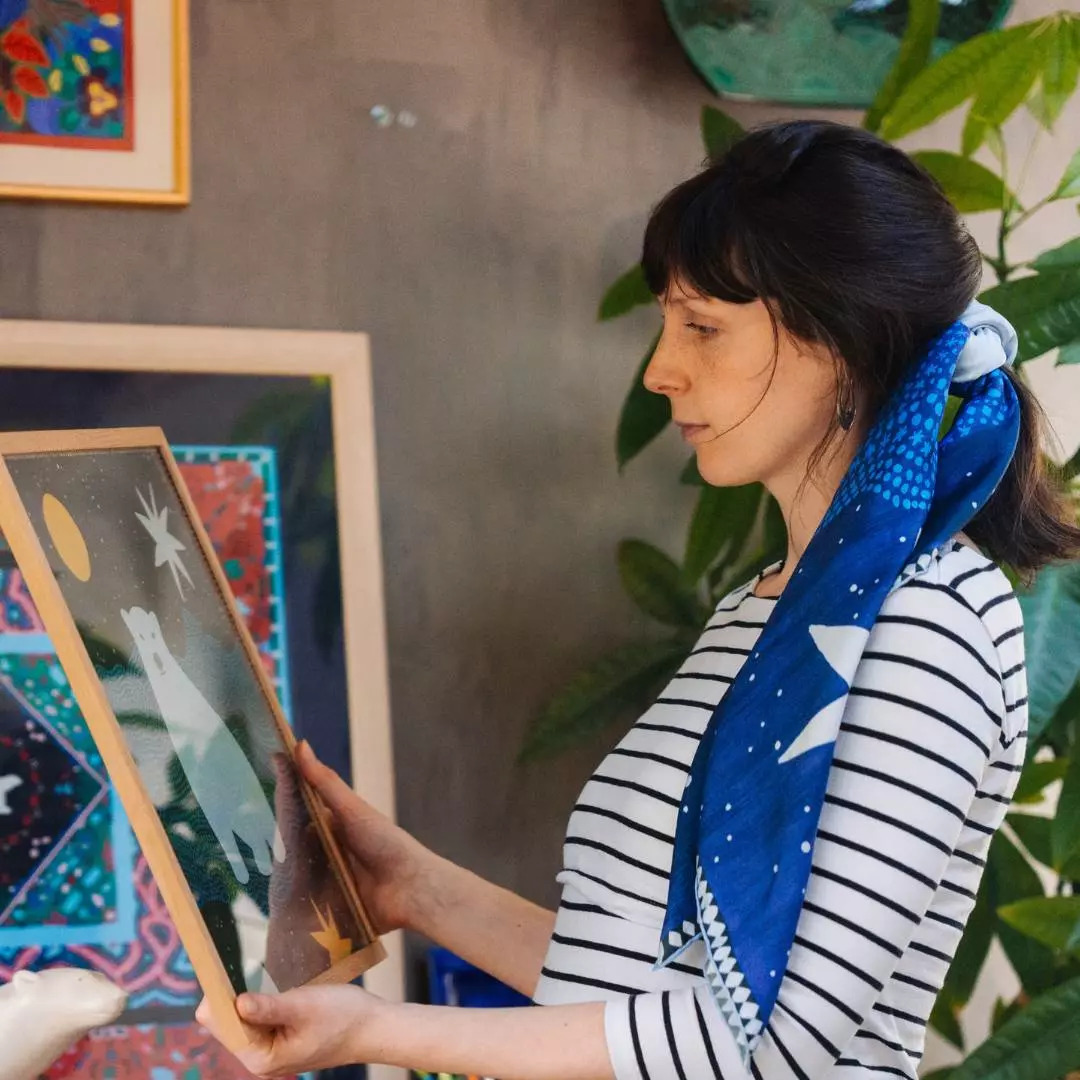 Artisane d’art, Ourse Blanche peint ses tableaux exclusivement à la main dans son atelier à Angers, puis les imprime bruts sur la soie, non retouchés. Toutes les pièces sont imprimées et confectionnées près de Lyon, dans des ateliers labellisés « Entreprises du Patrimoine Vivant ».