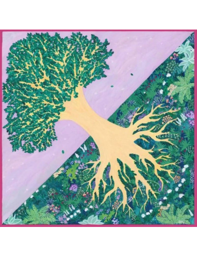 Le grand foulard en soie l'Arbre Magique est un vrai tableau à porter. Le tableau l'Arbre Magique est un hommage aux arbres millénaires qui nous entourent. Il est notamment inspiré de l'univers de la forêt du film d'animation Princesse Mononoké, de Hayao Miyazaki. Une végétation foisonnante cachée, dans une douce atmosphère, pleine de mystères.