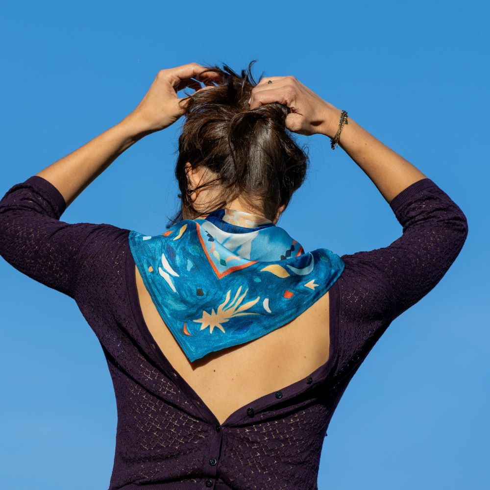 Ce grand carré de soie est un cadeau d’exception à offrir ou s’offrir. Original, coloré, artistique et écoresponsable, il fera pour sûr une grande surprise ! Chaque pièce est ainsi emballée avec soin, accompagnée de la carte racontant l’histoire du tableau et les conseils d’entretien de la soie.