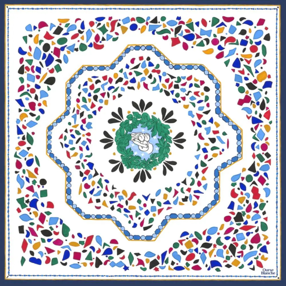 Artisane d’art, Ourse Blanche peint ses tableaux exclusivement à la main dans son atelier à Angers, puis les imprime bruts sur la soie, non retouchés. Toutes les pièces sont imprimées et confectionnées près de Lyon, dans des ateliers labellisés « Entreprises du Patrimoine Vivant ».