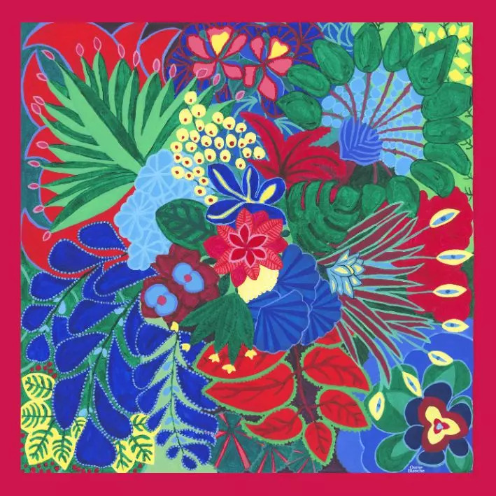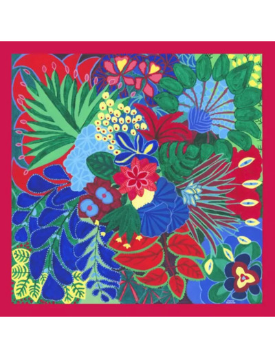 Le petit foulard en soie Eclore est imprimé d’un tableau représentant une jungle colorée et inextricable. Il vibre de couleurs vives et foisonne de plantes luxuriantes et de fleurs épanouies.