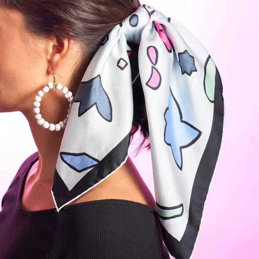 Le petit foulard en soie Envolée Cosmique a du caractère avec ses couleurs des années 80, son bord noir épais rétro et les formes d'Henri Matisse.