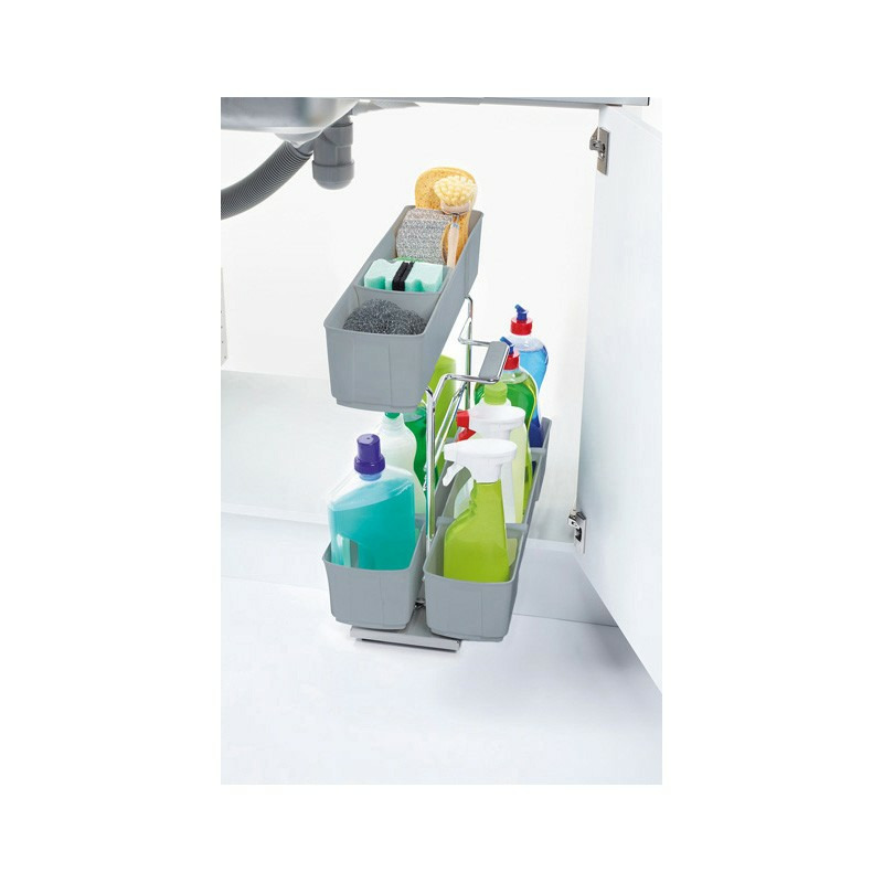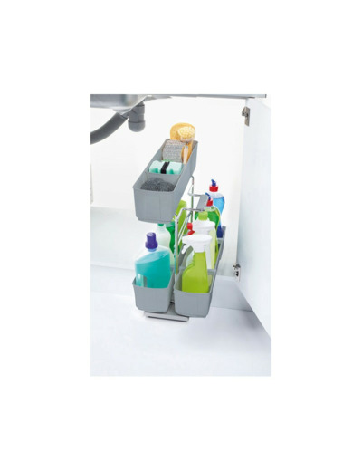 Ensemble coulissant, sur socle métal gris et armature chromée, équipé de coulisses sortie ¾ avec rappel en fin de course sur amortisseur. Fixation sur le fond du meuble.align="justify">Résistant à tous les produits d'entretien ménager.