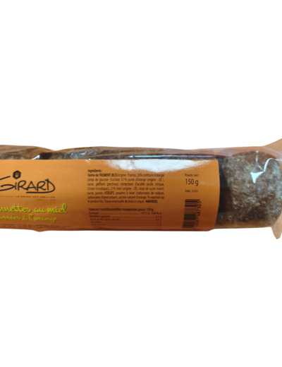 Ingrédients : Farine de FROMENT (BLE)(origine : France), 26% confiture d'orange (sirop de glucose- fructose, 9,1% purée d'orange (origine : UE ), sucre, gélifiant (pectines), correcteurs d'acidité (acide citrique, citrate trisodique)), 21% miel (origine : UE), sirop de sucre inverti, sucre, jaunes d'OEUFS, poudres à lever (carbonates de sodium, carbonates d'ammonium), arôme naturel d'orange. % exprimé sur le produit fini.