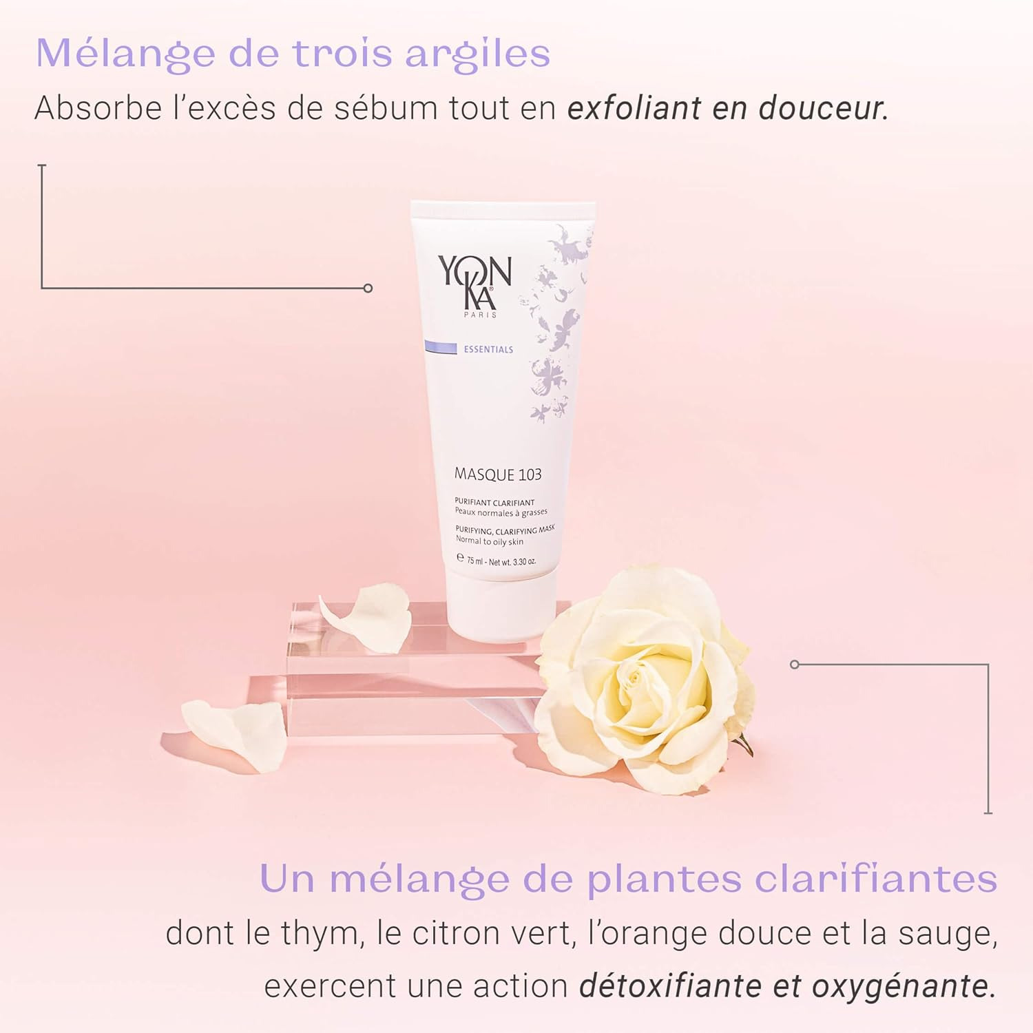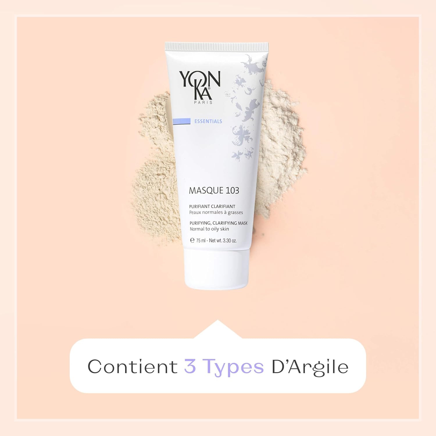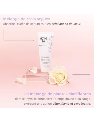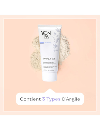 Information sur notre produit : Ce Masque 103 peaux normales ou grasses, aux 3 argiles détoxifiantes et aux huiles essentielles purifiantes assainit la peau, absorbe l'excès de sébum, resserre les pores et éclaircit le teint.