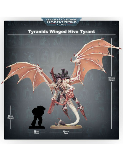 En tant que commandants des essaims tyranides, les Tyrans des Ruches appliquent la volonté de l'Esprit-Ruche sur le champ de bataille. Les Tyrans des Ruches Ailés sont engendrés pour diriger les essaims aéroportés et fournir un nœud synaptique mobile. Maniant toutes sortes de terrifiantes armes organiques, ces bioformes monstrueuses expriment tout la puissance synaptique de l'Esprit-ruche et répandent la terreur et la mort partout où se pose l'ombre terrifiante de leurs grandes ailes.