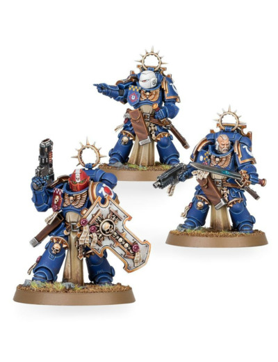 Menez la charge avec ces maîtres du combat rapproché. Chacun est armé d'une épée énergétique de maître et d'un bouclier Storm. Une option permet de promouvoir un membre de l'escouade au grade de sergent. Le kit propose aussi tout un choix de têtes, écus, pistolets et variantes d'étuis ainsi qu'un pistolet à plasma et un pistolet néo-volkite en option pour le sergent. Ces vétérans blanchis sous le harnois sont nantis des meilleures armures, qui ont fière allure aux couleurs de n'importe quel Chapitre.
