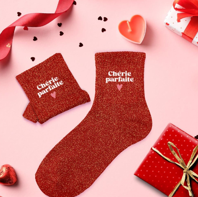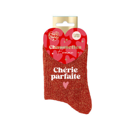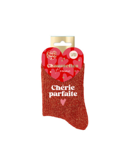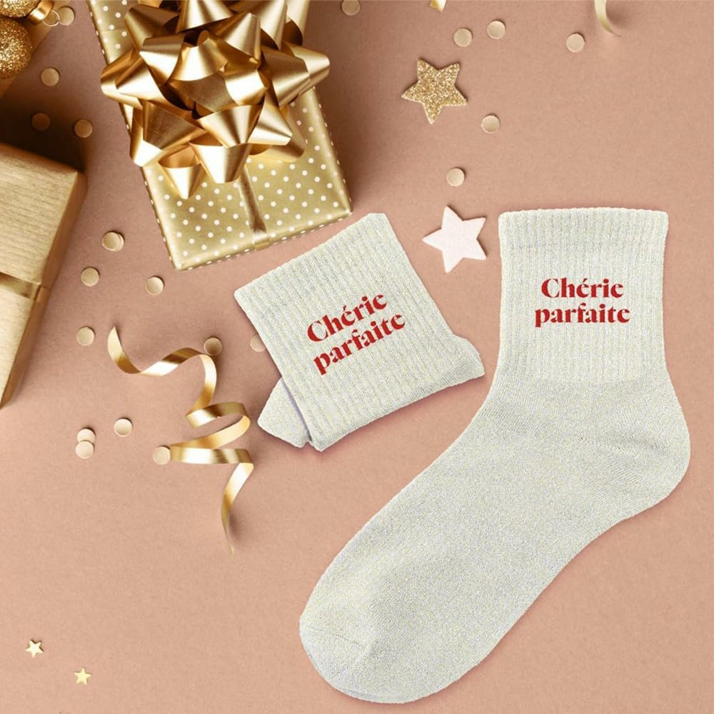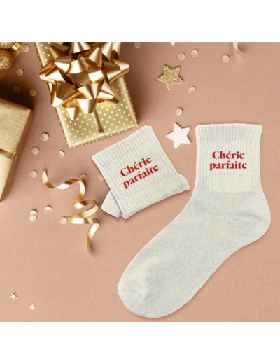 Paire de chaussettes en coton et polyester, coloris beige à paillettes scintillantes comportant le message chérie parfaite, à offrir pour un look audacieux et tendance. Taille unique : 36 - 42.