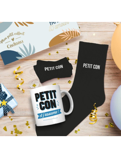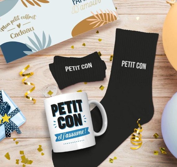 Offrez un cadeau mémorable avec ce coffret cadeau qui combine un mug élégant et une paire de chaussettes assorties.Le message "Petit con", le tout soigneusement emballé dans une boîte cadeau élégante.Le mug est idéal pour toutes les boissons chaudes, tandis que les chaussettes trouveront leurs utilité au quotidien. Chaque élément du coffret est à la fois fonctionnel et affectif. Taille 39/45.
