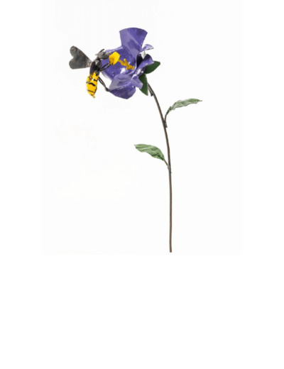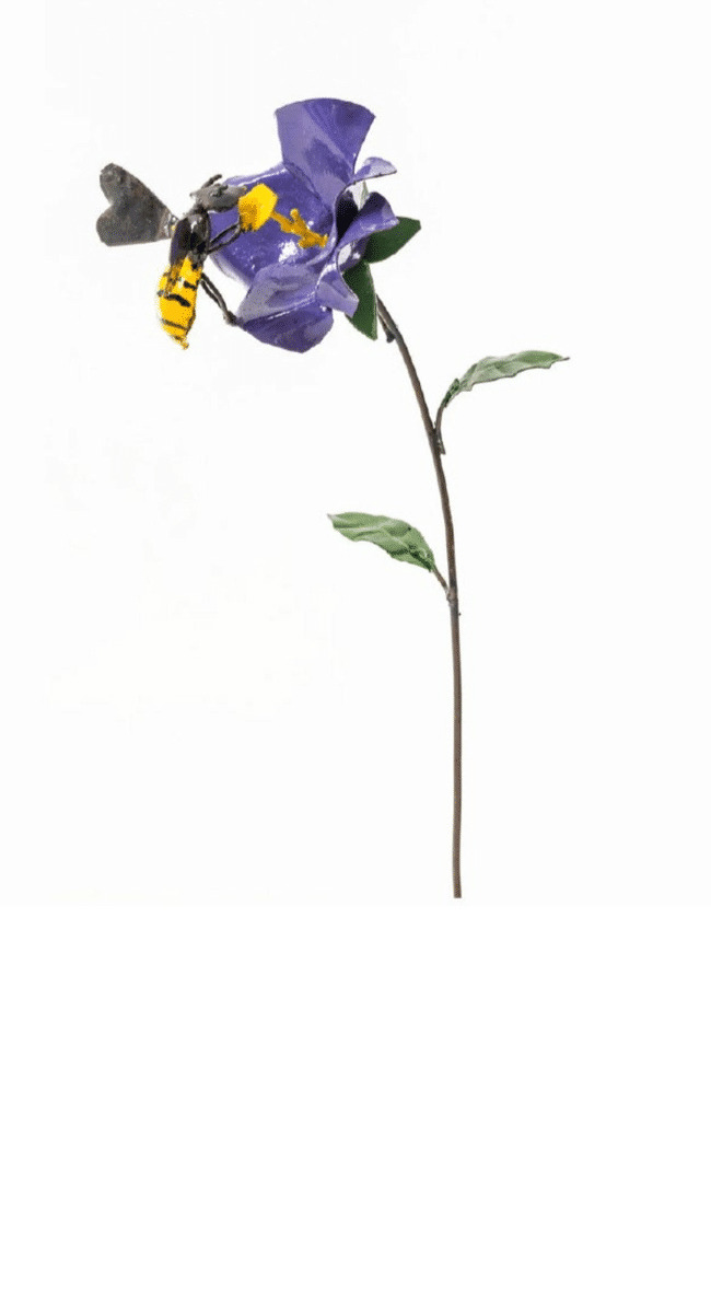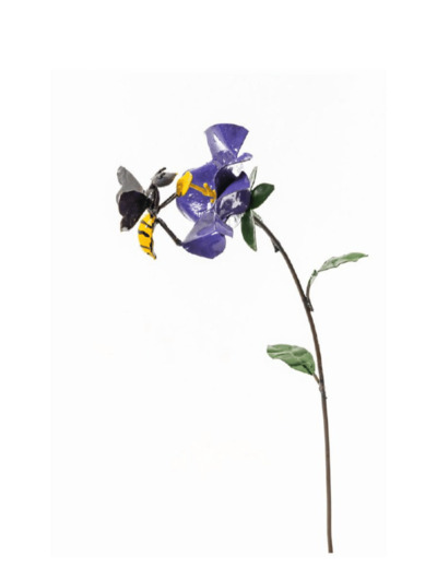 Jolie fleur Parme colorée et son abeille, en métal recyclé .