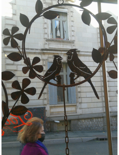 Décoration pour l extérieur, colombes sur cercle en acier brut plein , rouillé ,à suspendre.
